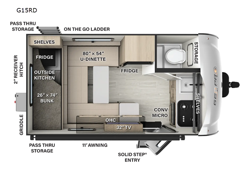 Inside, the Rockwood GEO Pro G15RD comfortably sleeps up to three people, making it perfect for small families or couples seeking a cozy getaway. The intelligently designed interior maximizes space and functionality, featuring a well-equipped kitchenette, a comfortable dining area that converts into a sleeping space, and ample storage to keep your essentials organized. The modern design and high-quality finishes create a welcoming atmosphere, ensuring you feel right at home no matter where your travels take you.