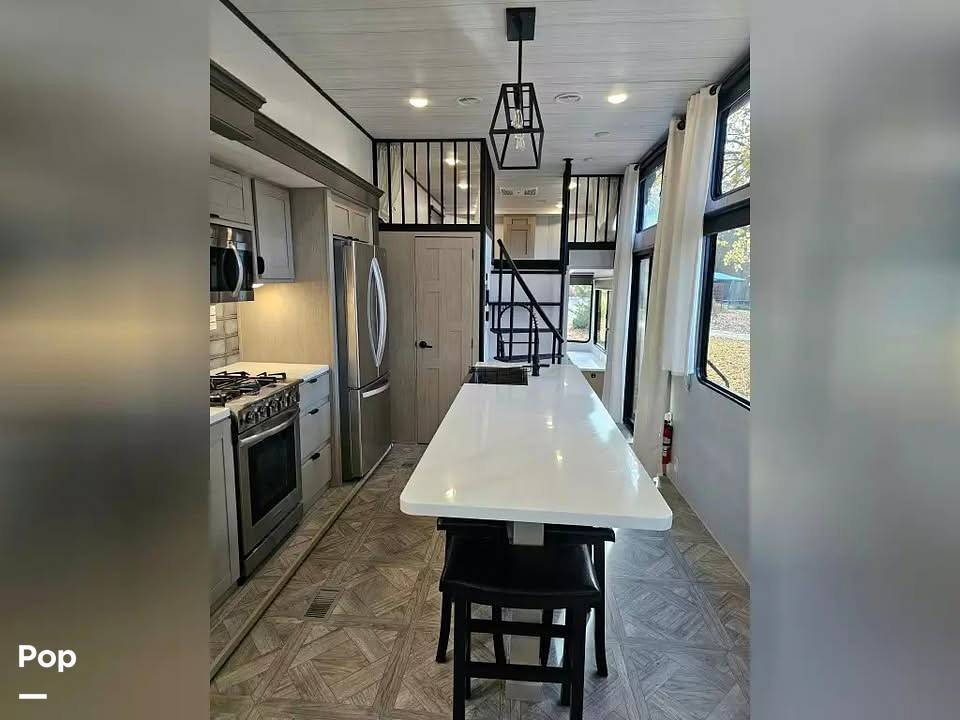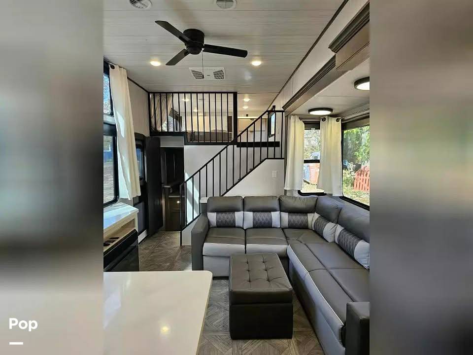 Step inside and you'll find a cozy living area that's perfect for lounging after a day of exploring. The kitchen is fully equipped with modern appliances, making it easy to whip up your favorite meals on the go. The dining area is spacious enough for everyone to gather around and enjoy a meal together. Plus, with multiple sleeping areas, including a master bedroom, bunk beds, and convertible sofas, everyone will have their own comfy spot to rest.