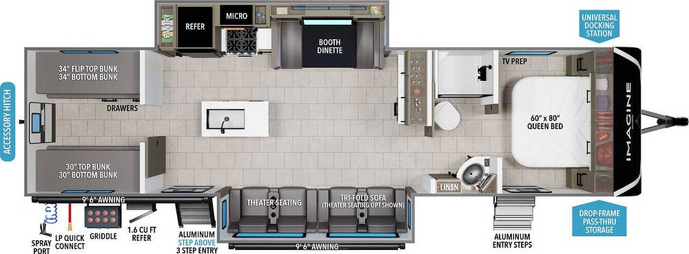 Step inside to find a beautifully appointed interior featuring modern amenities and thoughtful design. The Imagine 3210BH boasts a fully equipped kitchen with a large refrigerator, microwave, and stove, making meal prep a breeze. The cozy living area is perfect for unwinding after a day of exploration, complete with a plush seating arrangement and entertainment center. The master bedroom offers a peaceful retreat with a comfortable queen-sized bed, while the bunkhouse provides a fun and private space for the kids or extra guests.