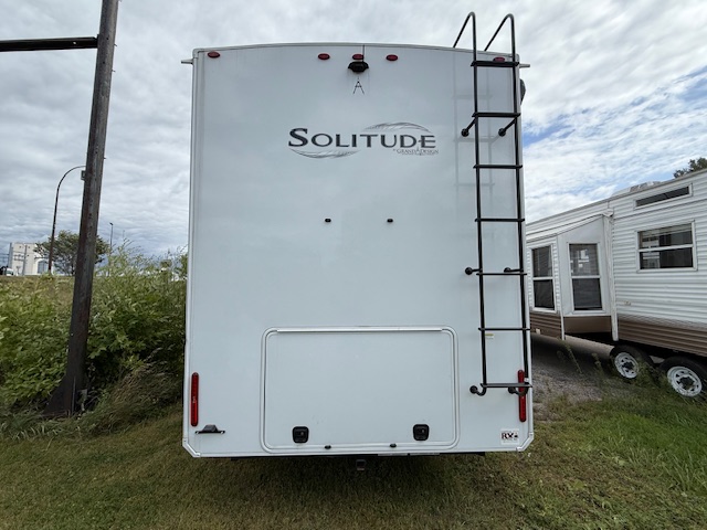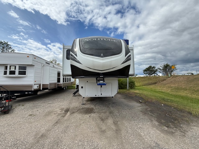The Solitude 380FL features five expansive slide-outs, maximizing the interior living space and providing a roomy, open atmosphere. The thoughtfully designed floor plan includes a spacious front living area, complete with plush seating and state-of-the-art entertainment options, perfect for unwinding after a day of adventure. The well-appointed kitchen is equipped with modern appliances and ample storage, ensuring that meal preparation is both convenient and enjoyable. The master suite offers a serene retreat with a comfortable bed and abundant storage, while additional sleeping accommodations are available for guests.
