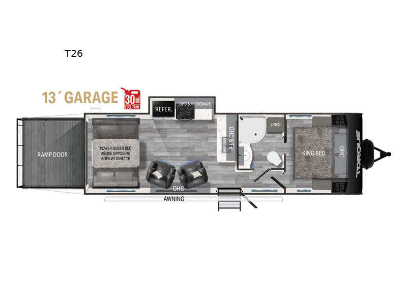 Introducing the 2024 Heartland Torque T26 Toy Hauler, the perfect blend of comfort, functionality, and adventure-ready design. This versatile RV is ideal for families or groups looking to explore the great outdoors without sacrificing the comforts of home. With a spacious interior featuring one slide-out, the Torque T26 offers ample living space, ensuring a comfortable stay for up to six people. Whether you're embarking on a weekend getaway or an extended road trip, this toy hauler is designed to meet all your needs.
