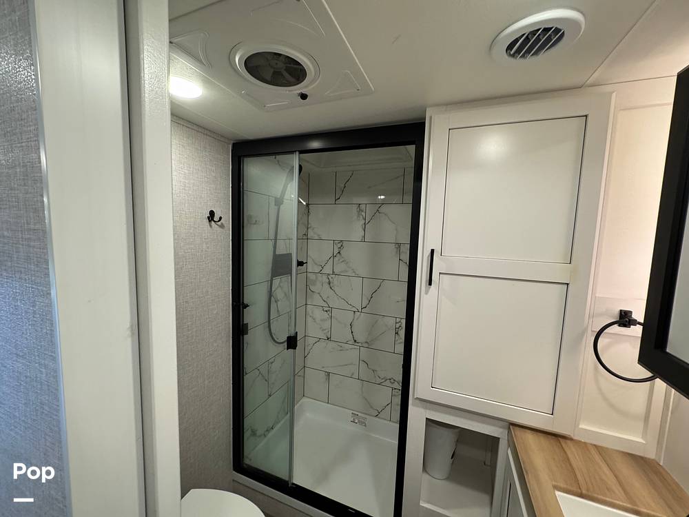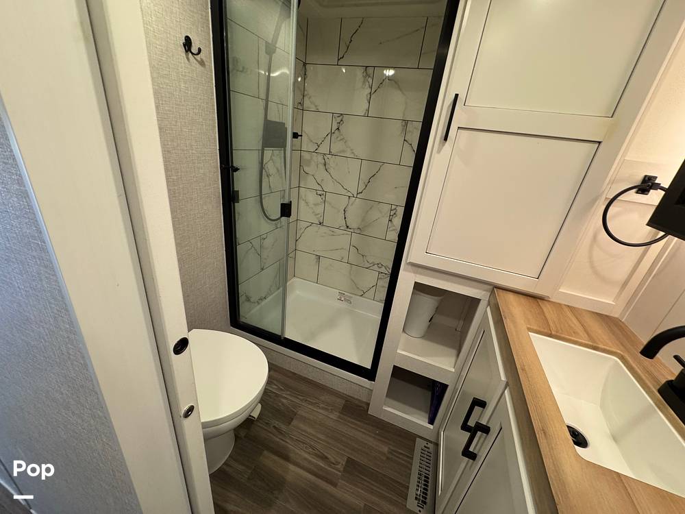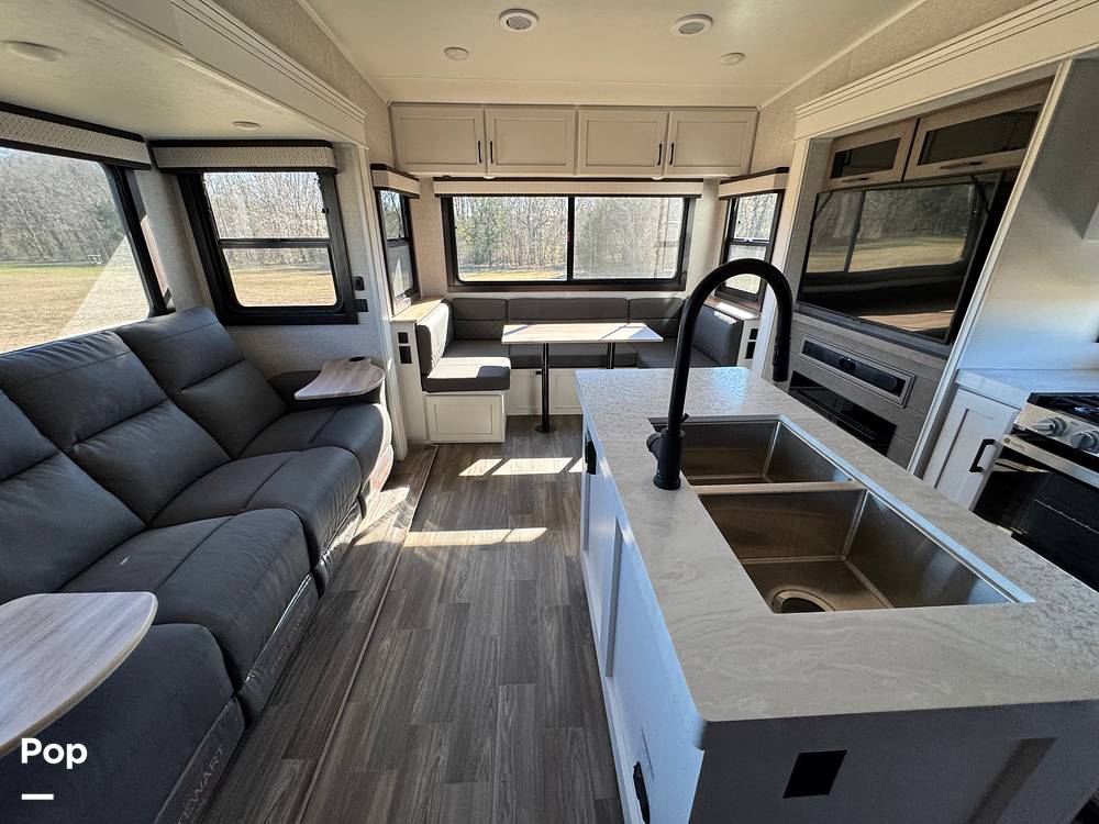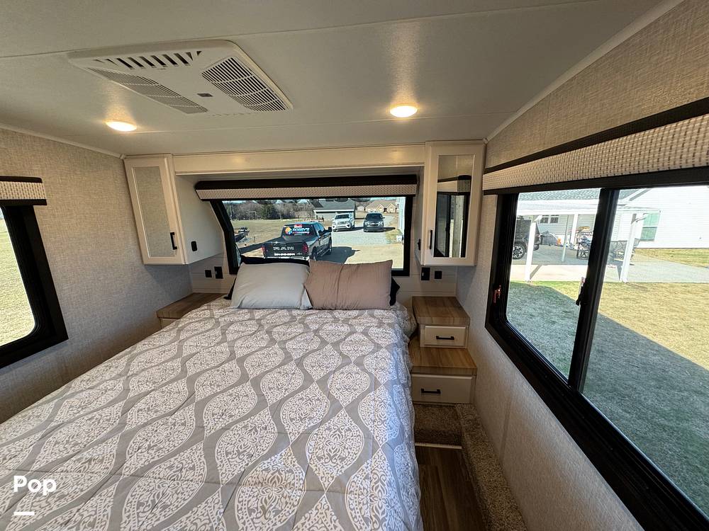 Measuring an impressive 31 feet in length, this fifth wheel provides ample room for relaxation and entertainment. Inside, you'll find a thoughtfully designed interior with high-quality finishes and modern amenities. The spacious living area is perfect for unwinding after a day of exploration, featuring plush seating and a state-of-the-art entertainment system. The fully equipped kitchen boasts top-of-the-line appliances, ensuring you can prepare your favorite meals with ease. The sleeping quarters are equally impressive, offering a restful retreat with comfortable bedding and plenty of storage space.