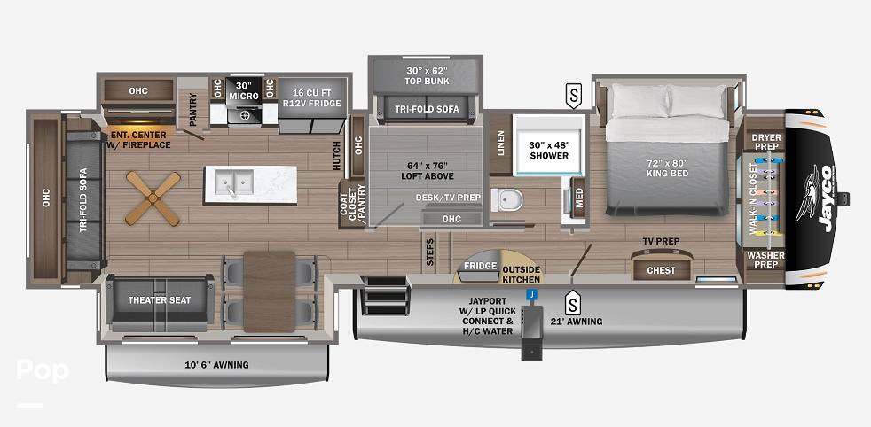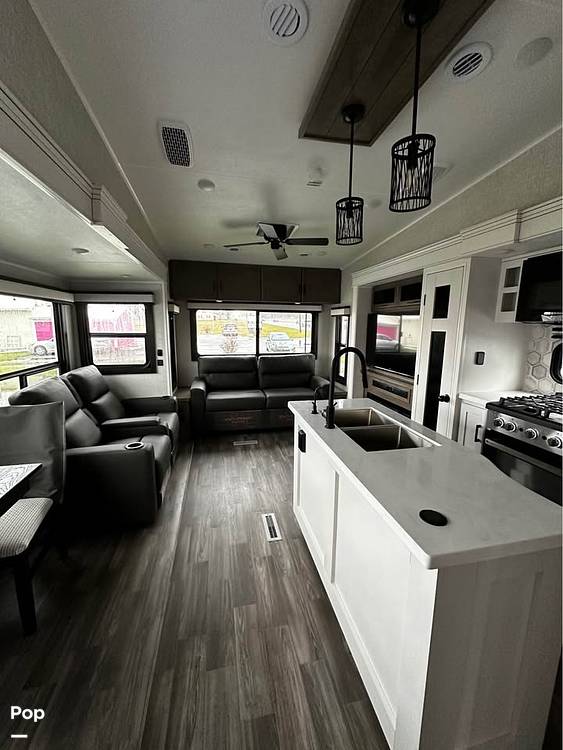 Outside, the Jayco Eagle 355 MBQS continues to impress with its sleek design and practical features. The large awning provides shade for outdoor relaxation, and the ample storage compartments ensure you can bring along all your essentials. Whether you're planning a weekend getaway or an extended road trip, this fifth wheel is built to handle it all with ease. Don't miss the opportunity to own this exceptional RV that promises unforgettable adventures and cherished memories with family and friends.