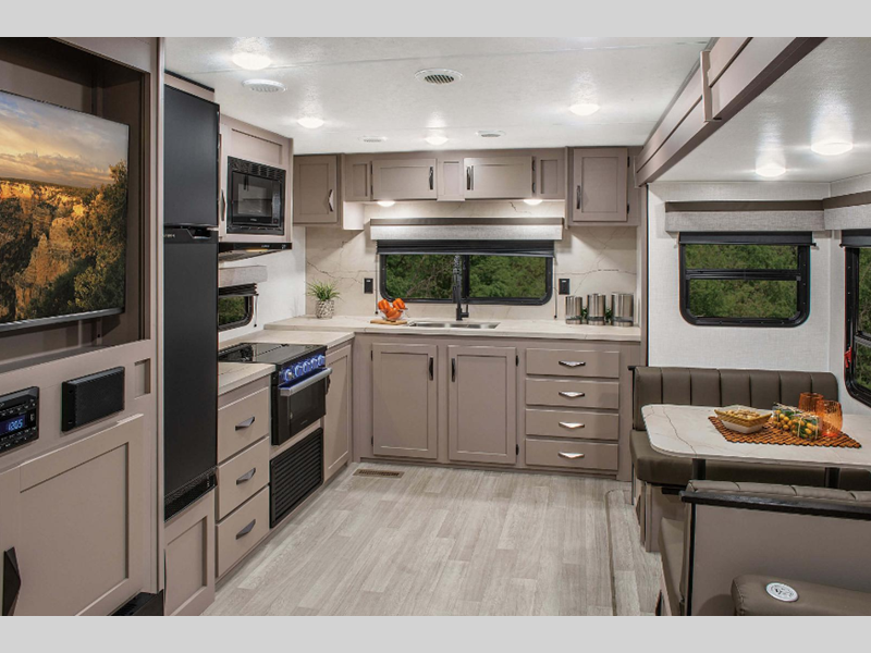 Inside, the KZ Connect C302FBK comfortably sleeps up to five people, offering a cozy retreat after a day of exploration. The intelligently designed floor plan maximizes space, providing a welcoming living area, a fully equipped kitchen, and a luxurious bathroom. Whether you're cooking a family meal or unwinding with a good book, this travel trailer offers all the amenities you need to feel right at home. The high-quality finishes and modern appliances ensure a premium experience, while the abundant storage options keep your belongings organized and accessible.