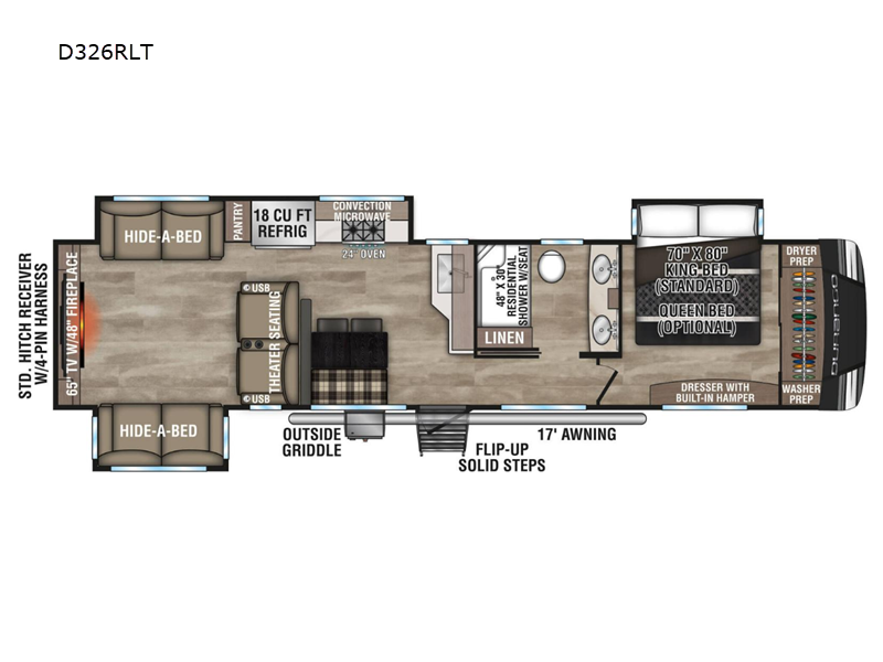 Introducing the 2024 KZ Durango D326RLT Fifth Wheel, a perfect blend of luxury and functionality for your next adventure. With a spacious design featuring three slide-outs, this RV offers ample room for relaxation and entertainment. Measuring approximately 31 feet in length, the Durango D326RLT provides a comfortable living space without compromising on maneuverability. Its robust construction ensures durability, while the sleek exterior design enhances its aesthetic appeal.