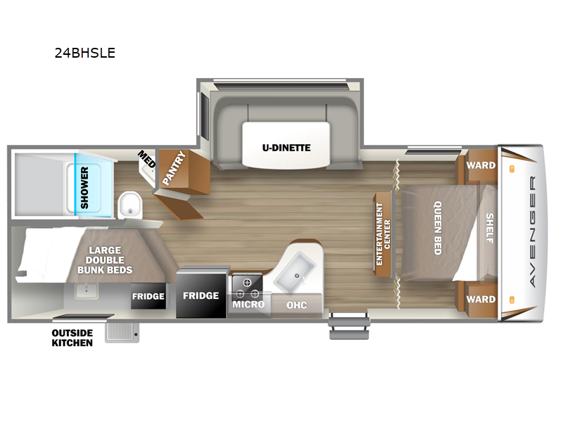 The Avenger LE 24BHSLE features a single slide-out, which significantly enhances the living space, providing a spacious and inviting environment for relaxation and entertainment. Inside, you will find a thoughtfully designed layout that maximizes space and functionality. The interior boasts high-quality finishes and modern amenities, ensuring a luxurious experience on the road. The well-equipped kitchen, comfortable sleeping arrangements, and ample storage space make this RV a home away from home.