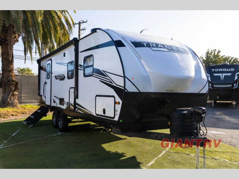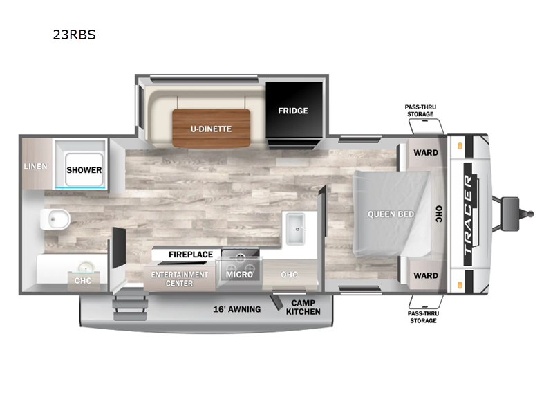The Tracer 23RBS features a single slide-out, enhancing the living space to create a more open and inviting atmosphere. This model comfortably sleeps up to four people, making it ideal for small families or couples seeking a cozy getaway. The intelligently designed floor plan includes a well-appointed kitchen, a comfortable seating area, and a private sleeping space, ensuring that every journey is as enjoyable as the destination. The modern amenities and high-quality finishes throughout the trailer reflect Prime Time's commitment to excellence and attention to detail.