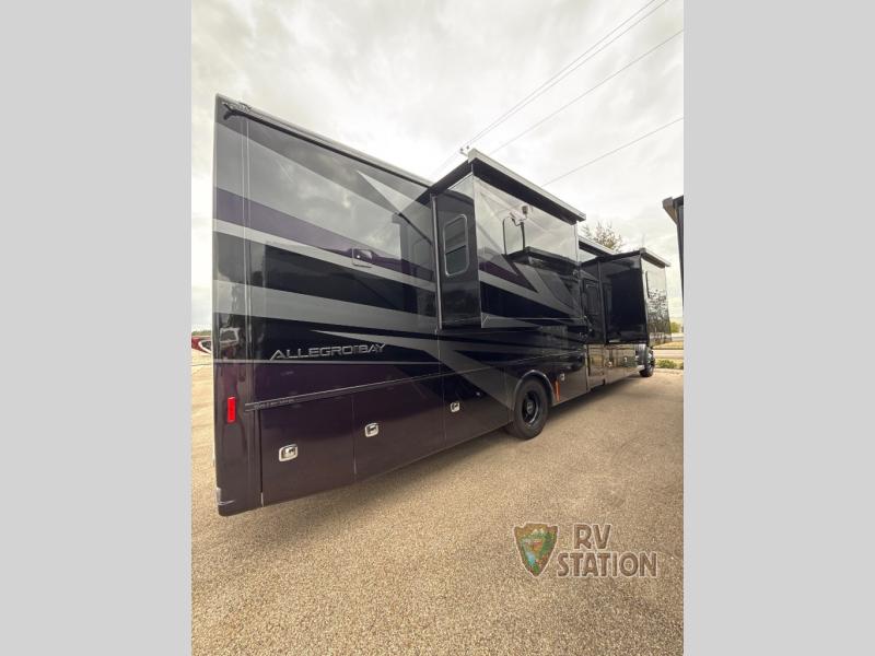 Step inside and be greeted by a beautifully designed interior that boasts high-quality finishes and thoughtful amenities. The Allegro BAY 38BB features a well-appointed kitchen with modern appliances, including a large refrigerator, convection microwave, and a three-burner cooktop, all designed to make meal preparation a breeze. The cozy living area is perfect for unwinding after a day of exploration, with plush seating and a state-of-the-art entertainment system to keep everyone entertained.