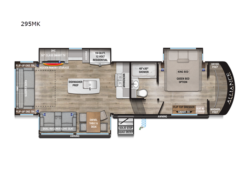 Introducing the 2025 Alliance RV Paradigm 295MK Fifth Wheel, a premium choice for those seeking luxury and comfort on the road. This meticulously designed RV offers an exceptional blend of space, functionality, and modern amenities, making it an ideal home away from home. With a length of 28 feet and a weight of approximately 5,296 kilograms, this fifth wheel is engineered for stability and ease of towing, ensuring a smooth journey wherever your adventures take you.