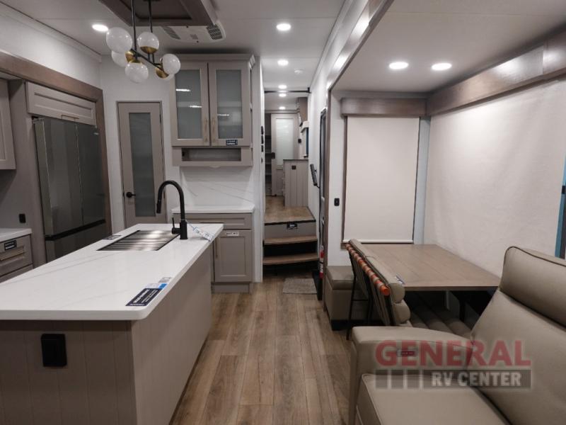 The Paradigm 310RL features three expertly designed slide-outs, significantly enhancing the living space and providing a spacious interior that can comfortably sleep up to four people. The thoughtful layout includes a master bedroom with a premium queen-sized bed and a convertible sofa bed in the living area, ensuring restful nights for all occupants. The interior is meticulously crafted with high-quality materials and finishes, offering a sophisticated ambiance that complements its modern amenities. The fully equipped kitchen, complete with state-of-the-art appliances, allows for effortless meal preparation, while the elegant dining area provides a perfect setting for family meals or entertaining guests.