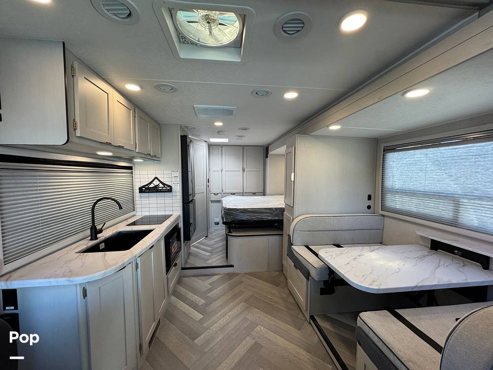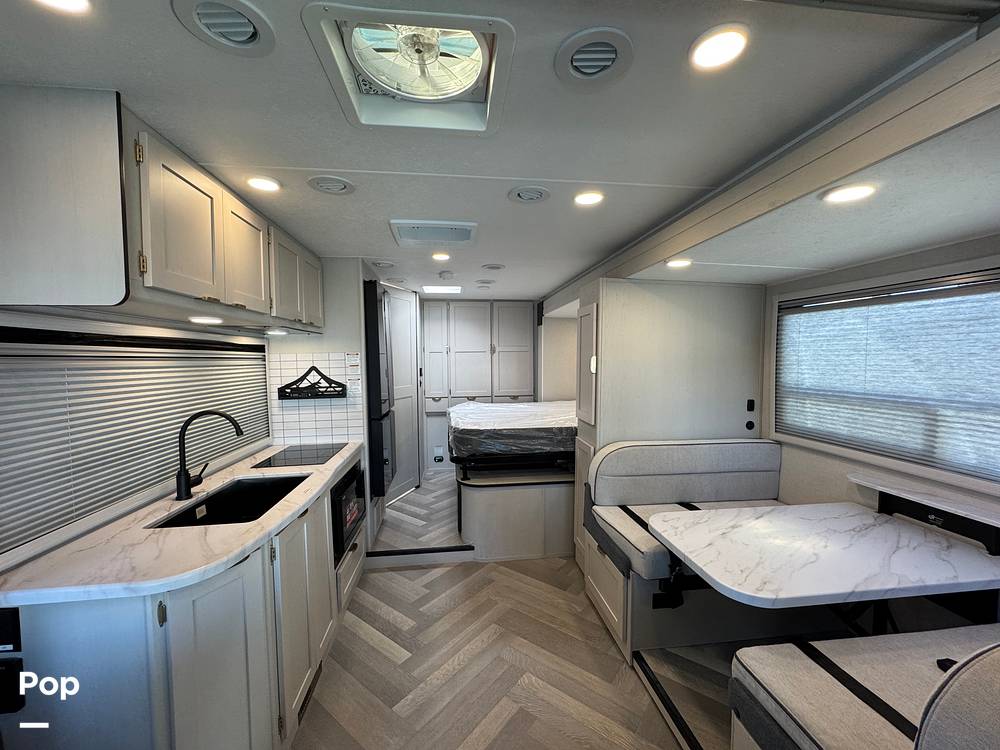 Inside, the RV comfortably accommodates up to four people, making it perfect for family getaways or trips with friends. The interior is thoughtfully designed to maximize space and utility, featuring a fully equipped kitchen with modern appliances, a cozy dining area, and a well-appointed bathroom. The sleeping arrangements include a plush queen-sized bed and a convertible dinette, ensuring restful nights after a day of exploration. High-quality materials and finishes throughout the RV add a touch of elegance and durability, promising a home-like atmosphere on the road.