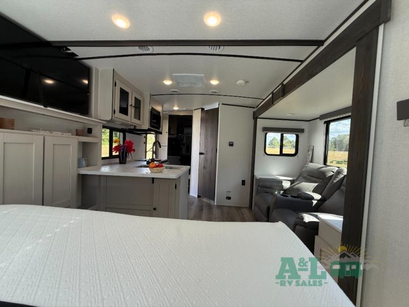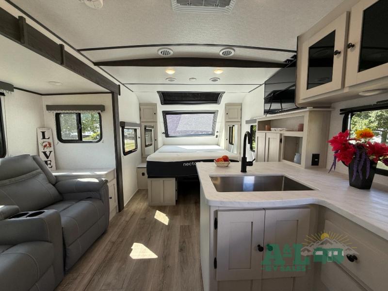 Inside, you'll find a well-appointed living space equipped with all the essentials for a comfortable journey. The kitchen area is designed for efficiency, featuring modern appliances and ample storage, while the bathroom offers privacy and convenience. The Northern Spirit Ultra Lite is crafted with high-quality materials and attention to detail, ensuring durability and longevity. Whether you're embarking on a weekend getaway or an extended road trip, this travel trailer promises a seamless and enjoyable experience, making it a wise investment for those who value quality and adventure.