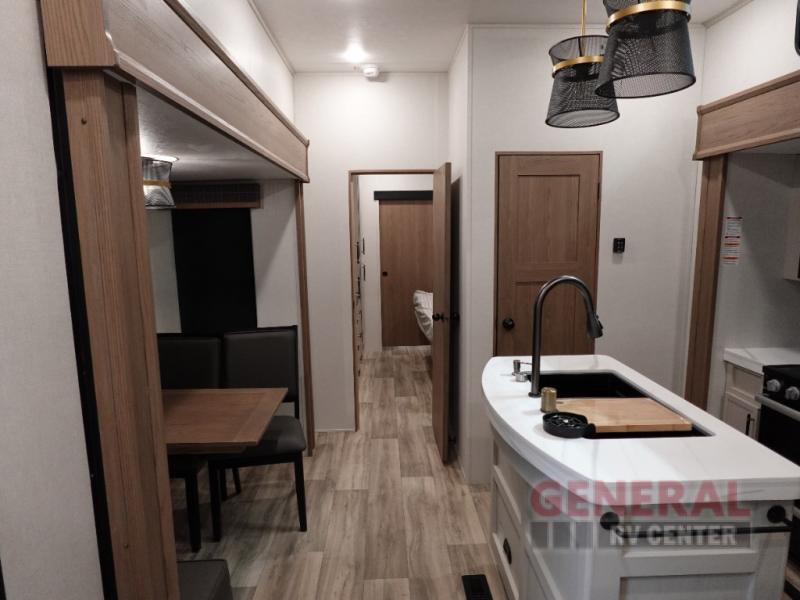 This fifth wheel features five strategically designed slide-outs, maximizing the living space to accommodate up to six people comfortably. The intelligent layout ensures that every inch of the RV is utilized efficiently, providing a cozy yet expansive environment. The Astoria 3803FLP is equipped with high-quality furnishings and modern amenities, ensuring a home-like feel wherever your travels take you. Whether you're lounging in the plush seating area or preparing meals in the fully equipped kitchen, this RV promises an unparalleled level of comfort.