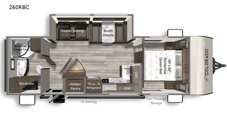 Inside, the Colorado 260RBC offers a cozy retreat that can comfortably sleep up to three people. Whether you're planning a romantic getaway or a solo adventure, you'll find everything you need for a relaxing stay. The interior is thoughtfully designed with a focus on maximizing space and functionality. Enjoy a restful night's sleep on the plush sleeping arrangements, and take advantage of the well-equipped kitchen to whip up your favorite meals on the go. The stylish decor and modern amenities create a welcoming atmosphere that feels just like home.