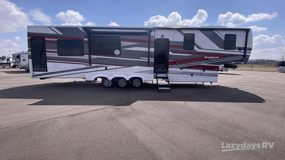 The RiverStone 44DBL features four expansive slide-outs, maximizing the interior living space and providing a truly open and inviting atmosphere. Inside, you'll find a meticulously crafted interior with high-end finishes and modern amenities. The spacious living area is perfect for hosting guests, while the state-of-the-art kitchen is equipped with top-of-the-line appliances, ensuring you have everything you need to prepare gourmet meals on the go. The master suite offers a serene retreat with its plush bedding and ample storage, while the additional bathroom ensures convenience and privacy for all occupants.