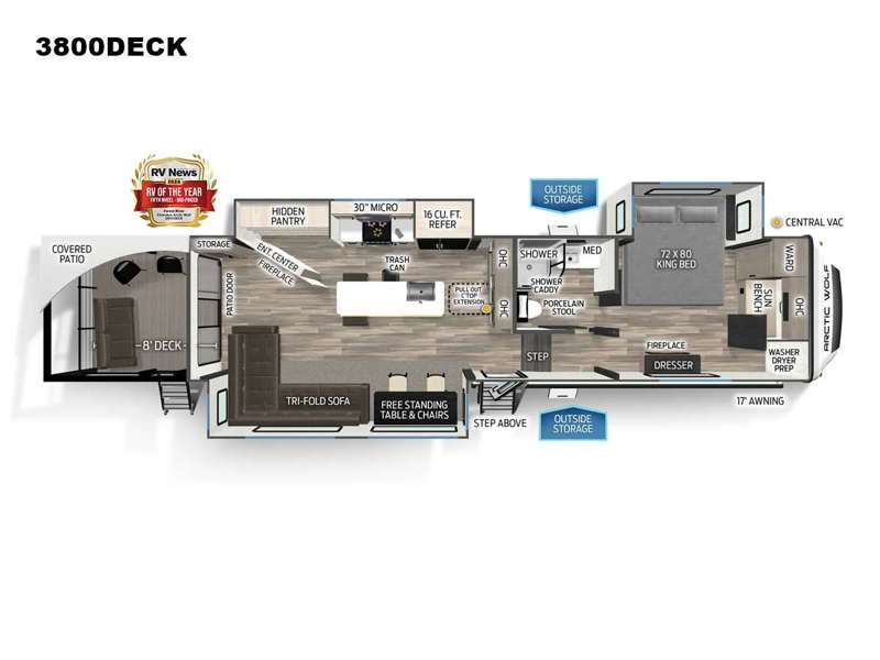One of the standout features of the Cherokee Arctic Wolf 3800DECK is its unique outdoor deck, measuring approximately 3 meters by 2 meters. This fantastic space is perfect for enjoying the great outdoors, whether you're sipping your morning coffee or hosting a sunset barbecue. With its robust construction and thoughtful amenities, this RV is ready to take you on unforgettable adventures. Don’t miss the chance to own this incredible RV and start making memories that will last a lifetime!