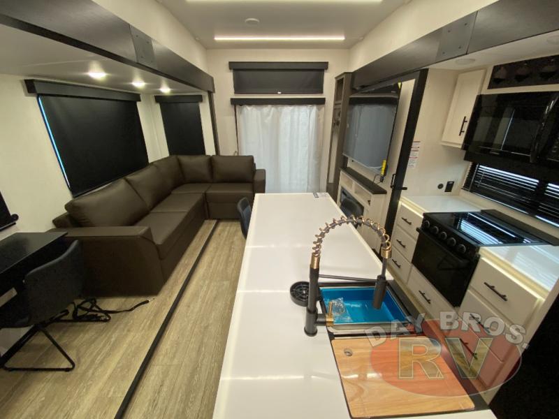 Step inside to discover a thoughtfully designed interior that boasts a spacious living area with plush seating and a cozy fireplace, perfect for relaxing after a day of adventure. The kitchen is a chef's dream, featuring modern appliances, a large refrigerator, and plenty of counter space to whip up your favorite meals. With a master bedroom that includes a comfortable queen-sized bed and ample storage, you’ll feel right at home wherever the road takes you. The RV also features a well-appointed bathroom with a roomy shower, ensuring you have all the comforts of home on the go.