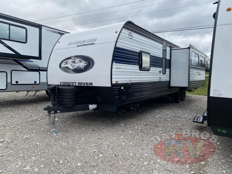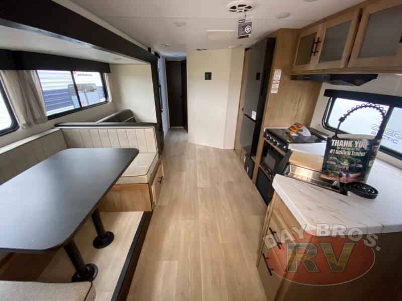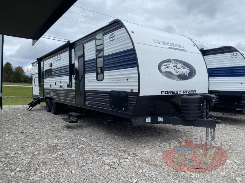 The Cherokee Grey Wolf 29TE features a single slide-out that expands the living area, creating a welcoming environment for relaxation and entertainment. Inside, you'll find accommodations to sleep up to nine people comfortably, making it ideal for family vacations or trips with friends. The intelligently designed floor plan includes a private master bedroom, double bunk beds, and convertible sleeping areas, ensuring everyone has their own space to unwind after a day of exploration.
