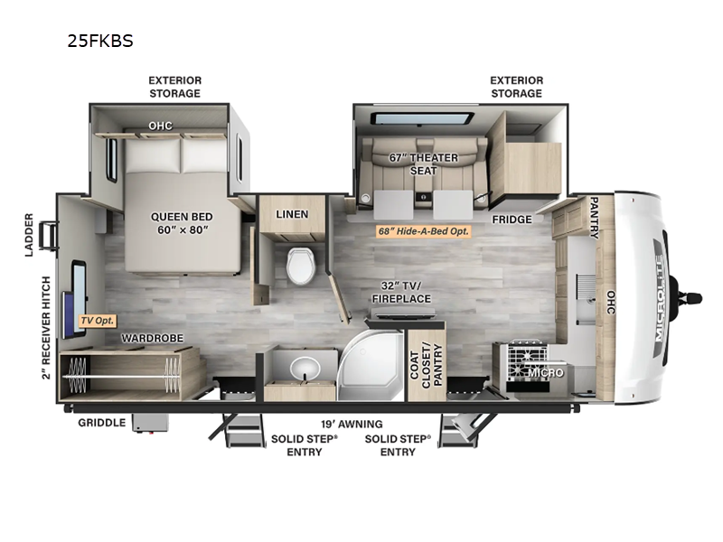 Introducing the 2025 Forest River RV Flagstaff Micro Lite 25FKBS Travel Trailer, a perfect blend of compact design and luxurious comfort. This meticulously crafted travel trailer is designed for those who appreciate quality and efficiency in their adventures. With an overall length of 21 feet, this RV is ideal for couples seeking a cozy yet spacious retreat on wheels. Its lightweight construction, weighing approximately 2,804 kilograms, ensures ease of towing without compromising on durability or stability.