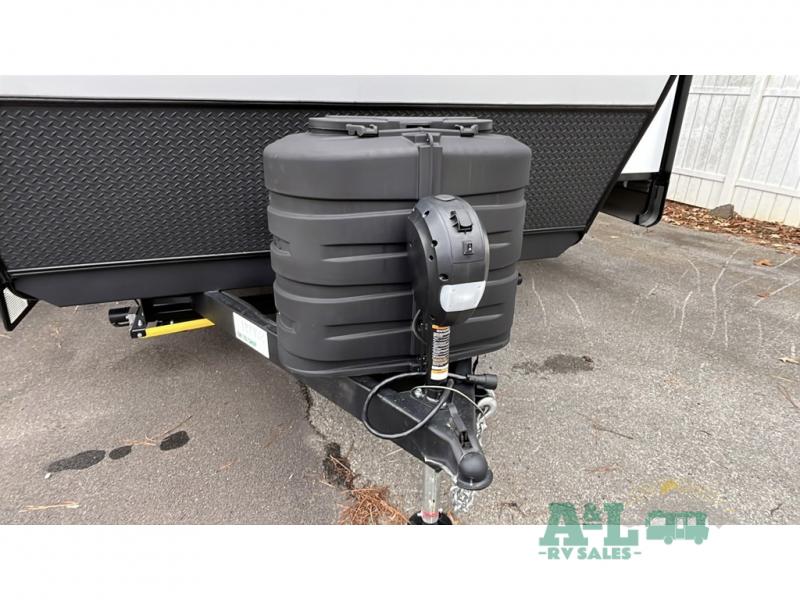 The Flagstaff Micro Lite 25FKBS features two strategically placed slide-outs that significantly enhance the living space, providing ample room for relaxation and entertainment. Inside, you'll find a thoughtfully designed layout that maximizes functionality and comfort. The interior is tailored to sleep two comfortably, making it an ideal choice for couples or solo travelers who value privacy and tranquility. The well-appointed kitchen and dining area offer all the amenities needed for convenient meal preparation and dining, while the inviting living area provides a perfect spot to unwind after a day of exploration.