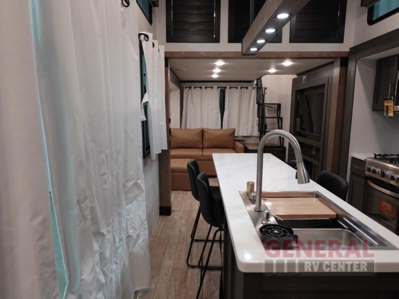With four slide-outs, this RV maximizes living space, providing a roomy and inviting atmosphere. The interior is designed to accommodate up to four people comfortably, making it perfect for small families or couples seeking a luxurious escape. The well-appointed living area features high-quality furnishings and finishes, ensuring a relaxing and enjoyable stay. The kitchen is equipped with modern appliances and ample storage, allowing you to prepare meals with ease while on the road.