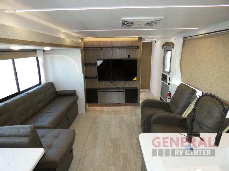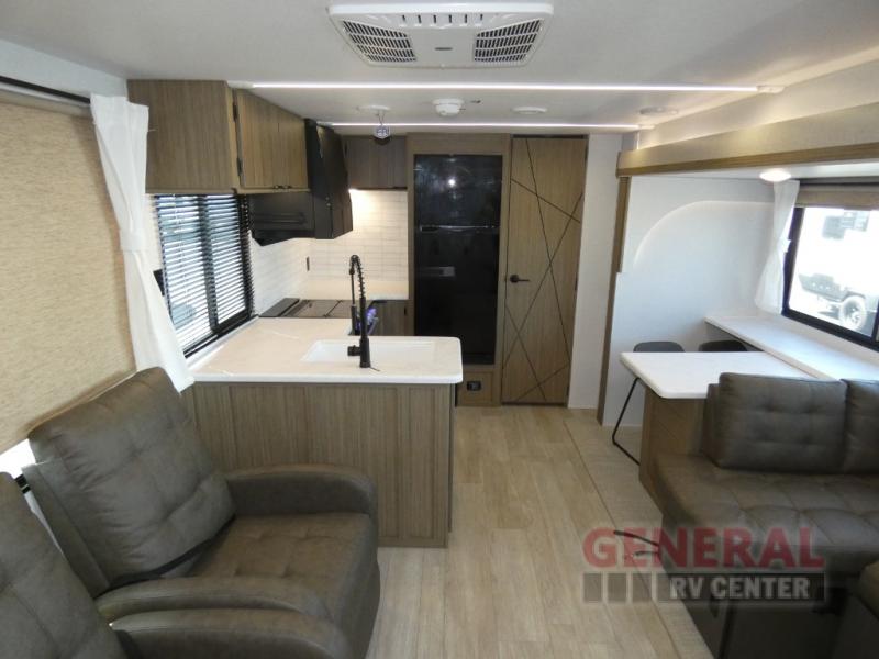 Step inside to experience the thoughtfully crafted interior, featuring a single slide-out that expands your living space, creating a welcoming atmosphere for up to four people. The well-appointed kitchen, complete with modern appliances and generous counter space, invites you to prepare delicious meals with ease. The cozy living area, adorned with plush seating, is perfect for unwinding after a day of adventure, while the private sleeping quarters ensure a restful night's sleep.