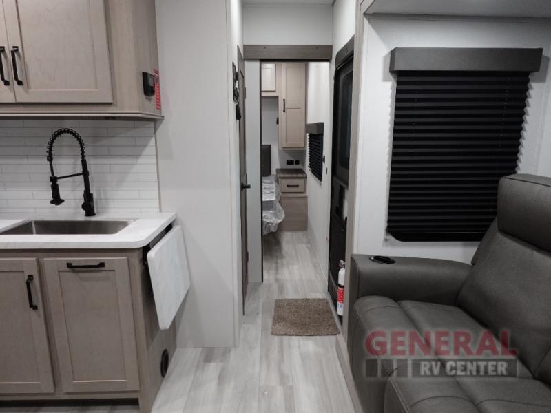 This impressive toy hauler features two slide-outs, maximizing the interior space to ensure a comfortable living environment. Measuring approximately 28 feet in length, the RV provides ample room for relaxation and entertainment. It can comfortably sleep up to four people, making it perfect for families or small groups. The interior is thoughtfully designed with high-quality materials and finishes, ensuring a luxurious and inviting atmosphere. The kitchen is equipped with modern appliances, while the living area offers plush seating and entertainment options.