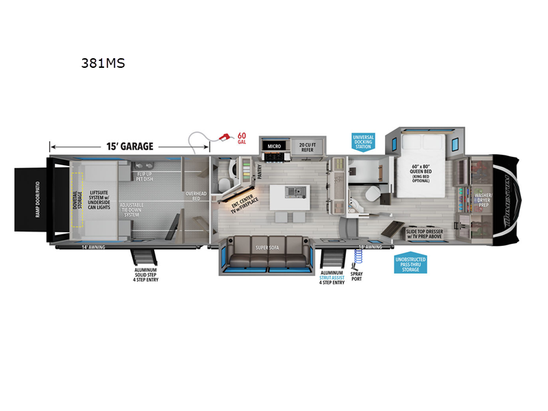 Measuring a generous 36 feet in length, the Momentum M-Class 381MS is built for both comfort and convenience. It boasts a robust fuel capacity of 227 liters, ensuring you can venture further without frequent stops. Weighing in at 7,466 kilograms, this fifth wheel is engineered for stability and ease of towing, making it a reliable partner on any journey. Inside, you'll find a well-appointed living space with all the amenities you need, from a fully equipped kitchen to cozy sleeping quarters.