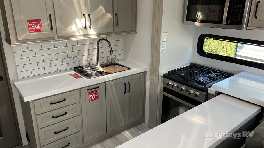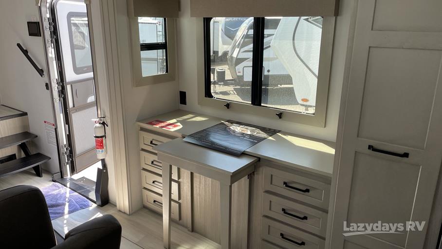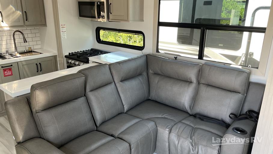 The Momentum M-Class 392M features three expertly crafted slide-outs, expanding the living area to provide a spacious and inviting environment. This RV can comfortably accommodate up to five people, making it ideal for families or groups of friends. The interior is thoughtfully designed with high-quality materials and finishes, ensuring a luxurious experience on the road. The well-appointed kitchen, cozy living area, and elegant sleeping quarters are all tailored to meet the needs of discerning travelers.