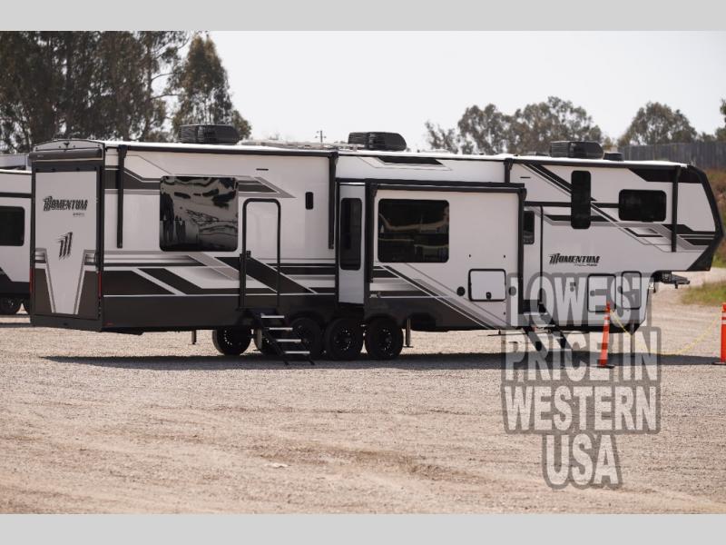 Step inside and experience the spaciousness provided by three expertly designed slide-outs, which create an inviting living area perfect for unwinding after a day of exploration. The Momentum M-Class 414M is not just about space; it's about smart design and functionality. The interior boasts high-end finishes and modern amenities, ensuring every journey is as comfortable as it is exciting. Whether you're cooking in the fully-equipped kitchen or enjoying a movie night in the cozy living area, this RV caters to all your needs.
