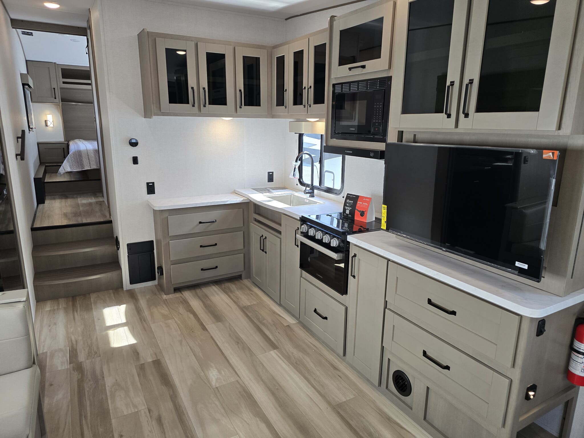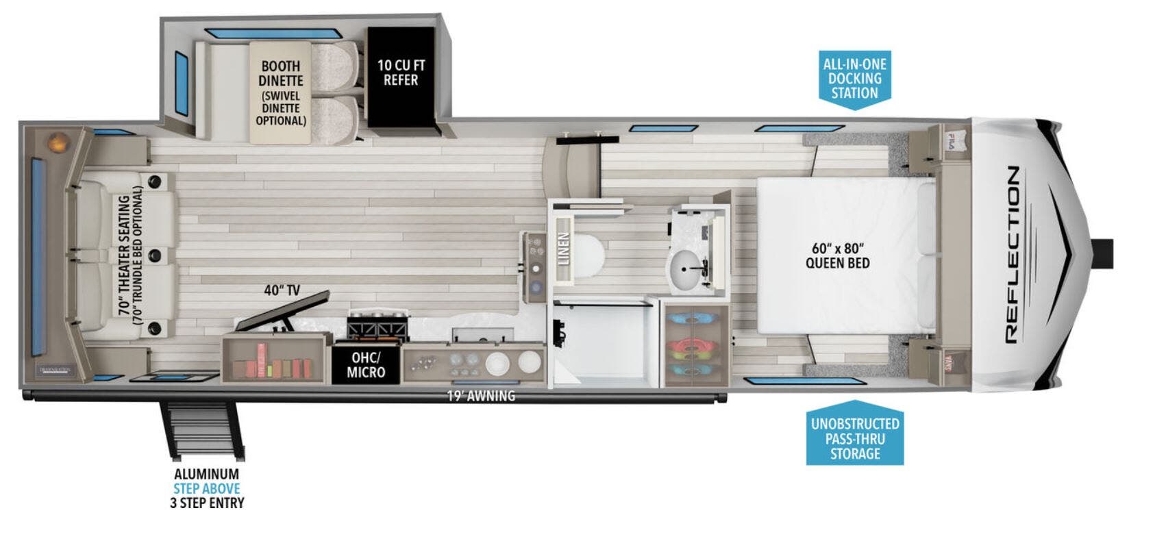 Inside, the Reflection 24RL comfortably accommodates up to four people, making it ideal for small families or couples seeking a getaway. The interior is thoughtfully designed with high-quality materials and finishes, providing a cozy and inviting atmosphere. The well-appointed kitchen features modern appliances and ample storage, allowing you to prepare meals with ease. The living area is equipped with plush seating and entertainment options, ensuring relaxation after a day of exploration. The sleeping quarters offer restful comfort, with a master bedroom and convertible sleeping space to suit your needs.