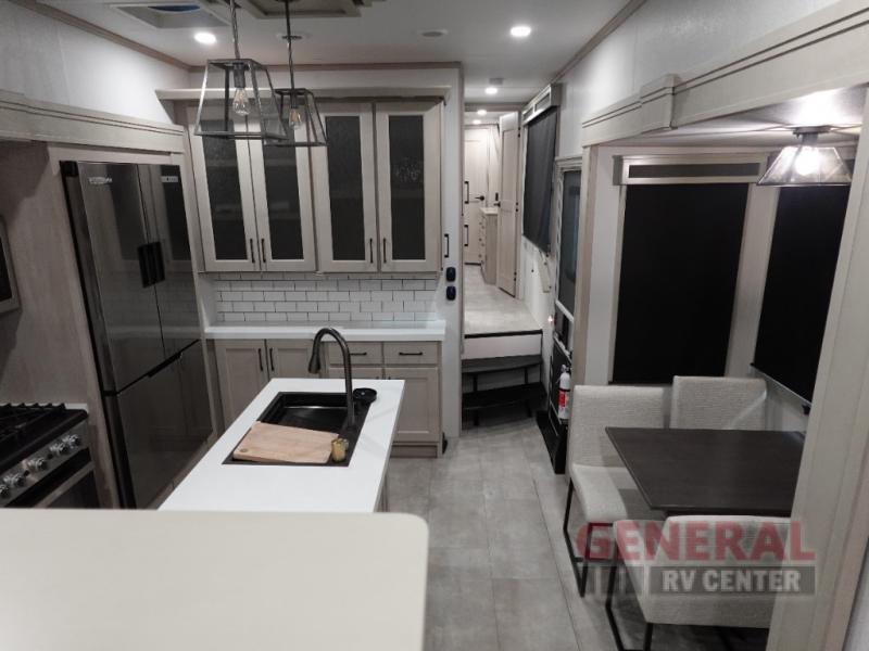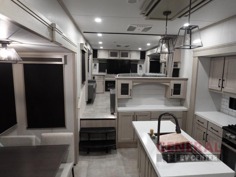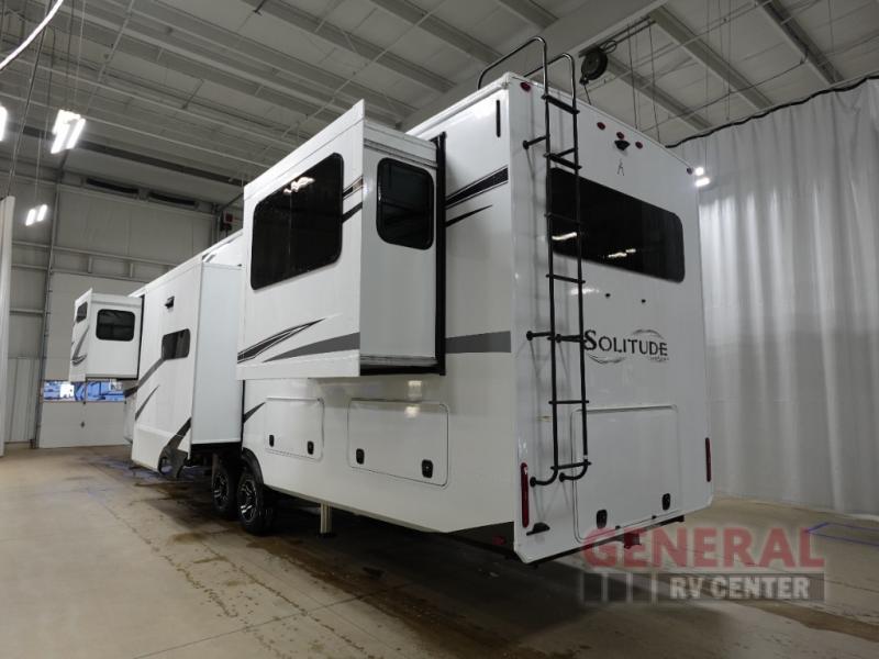 Featuring five slide-outs, the Solitude 376RD maximizes interior space, providing a roomy and inviting atmosphere. The well-appointed living area is perfect for gatherings, boasting plush seating and a state-of-the-art entertainment system. The fully equipped kitchen comes with modern appliances and plenty of counter space, ensuring meal preparation is a breeze. The master bedroom offers a serene retreat with a comfortable bed and generous storage, while additional sleeping accommodations are available in the loft and convertible sofa beds.