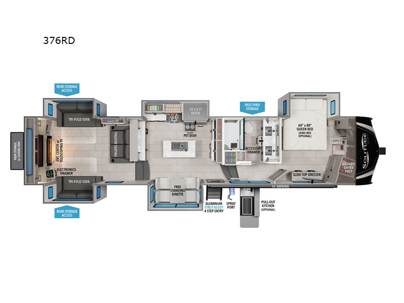 Weighing in at around 6,892 kilograms, the Solitude 376RD is built for both durability and ease of towing. Its innovative design and superior craftsmanship ensure a smooth and enjoyable travel experience. Whether you're embarking on a cross-country journey or setting up camp in your favorite spot, this fifth wheel offers all the comforts of home with the freedom of the open road. Don't miss the opportunity to make unforgettable memories in this exceptional RV. Your adventure awaits!