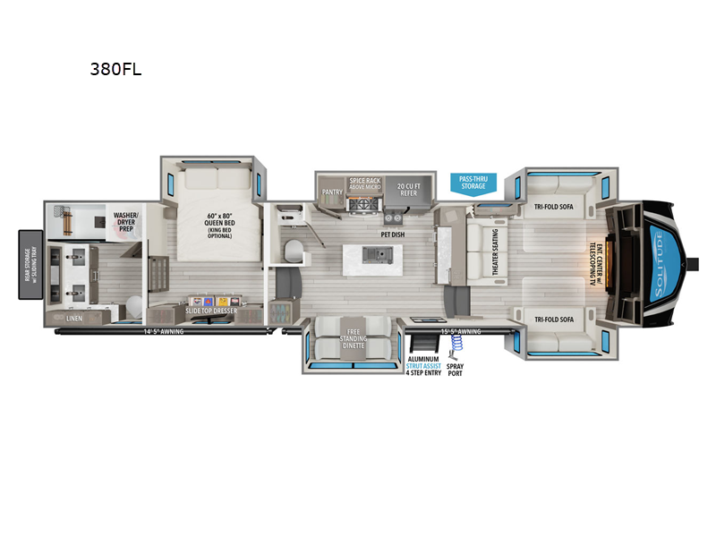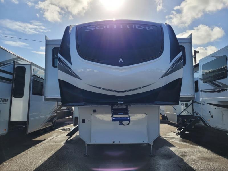 Inside, the Solitude 380FL comfortably accommodates up to six people, making it ideal for families or groups of friends. The thoughtfully designed floor plan includes a spacious front living area, complete with plush seating and a state-of-the-art entertainment system. The kitchen is equipped with high-end appliances and ample counter space, allowing for effortless meal preparation. The master suite offers a serene retreat, featuring a luxurious bed and abundant storage options. Additionally, the RV's sophisticated design is complemented by high-quality finishes and modern amenities throughout.
