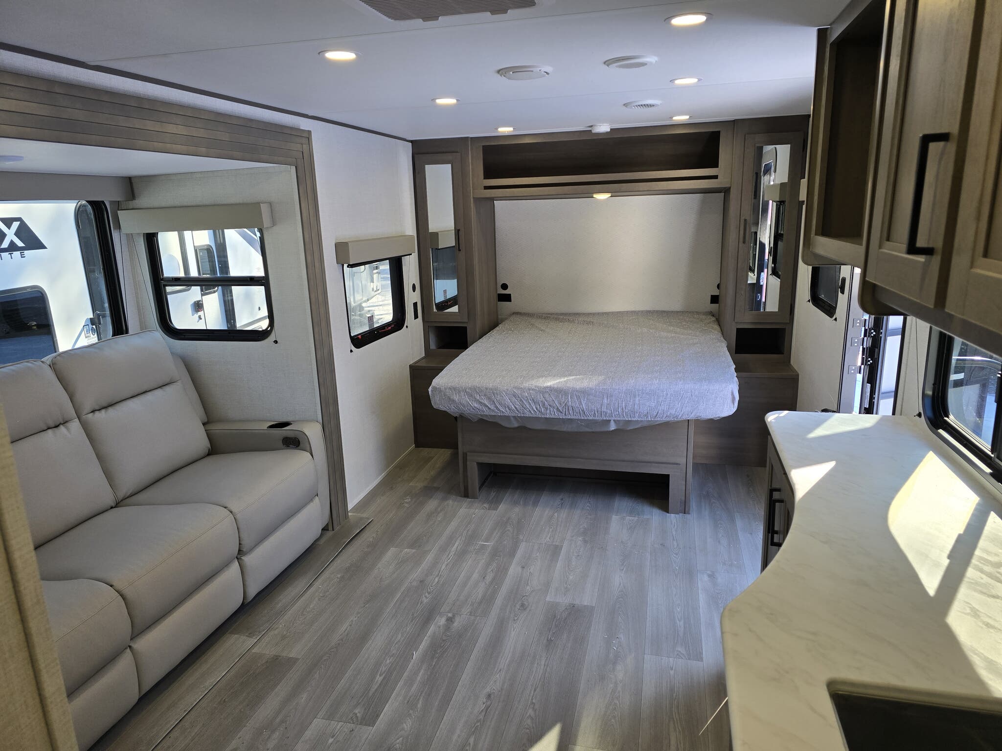 The Transcend Xplor 20MKX features a single slide-out, which significantly enhances the interior space, allowing for a more open and inviting atmosphere. This model comfortably accommodates up to four individuals, making it perfect for family getaways or trips with friends. The intelligently designed floor plan ensures that every inch of space is utilized efficiently, providing a cozy sleeping area, a fully equipped kitchen, and a comfortable living space for relaxation and entertainment. The high-quality materials and finishes throughout the interior reflect Grand Design's commitment to excellence and attention to detail.