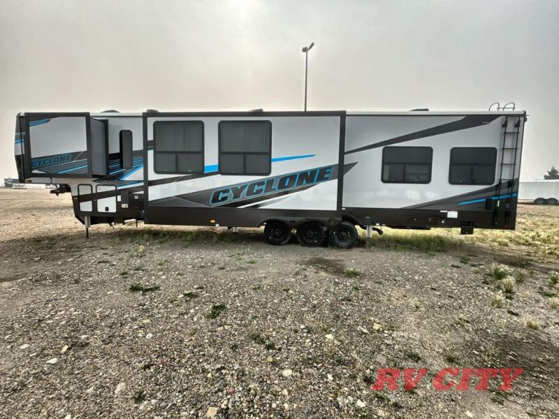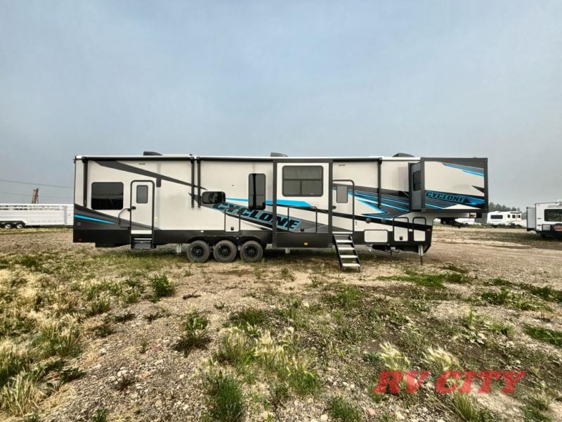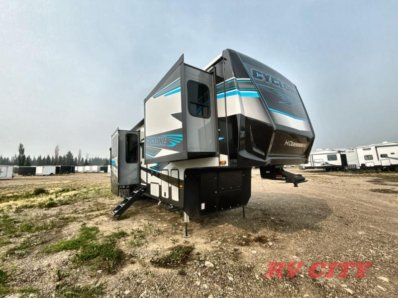 Introducing the 2025 Heartland Cyclone 4008 Fifth Wheel, a luxurious and spacious mobile retreat designed for those who seek adventure without compromising on comfort. This impressive RV boasts four slide-outs, providing ample living space for families and groups. With a sleeping capacity for up to eight people, it is perfect for family vacations, group outings, or extended road trips. The Cyclone 4008 is engineered to deliver a seamless blend of functionality and style, ensuring that every journey is both comfortable and memorable.