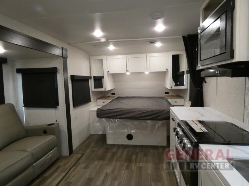Inside, you'll find a cleverly designed space that can comfortably sleep up to four people. Whether you're traveling with family or friends, everyone will have a cozy spot to rest after a day of exploring. The single slide-out expands your living area, giving you extra room to relax and unwind. The interior is thoughtfully laid out, featuring modern amenities and stylish finishes that make it feel like a home away from home.