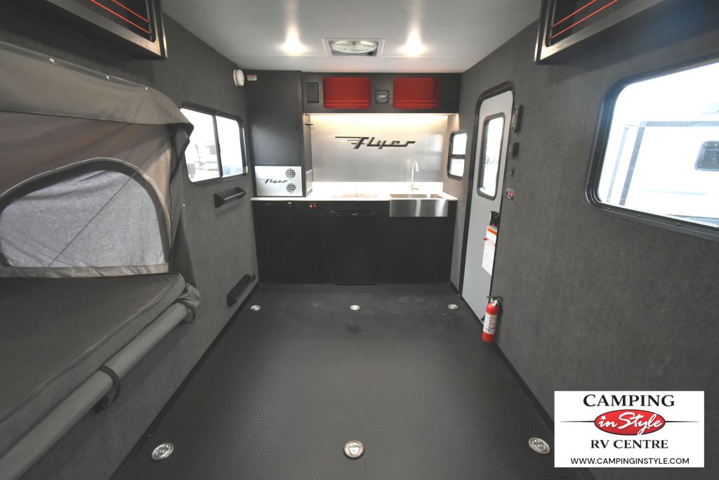 The Flyer Discover boasts a compact yet spacious design, measuring 14 feet in length. Its smart layout maximizes interior space, providing ample room for both living and storage. The ToyHauler feature allows you to bring along your favorite outdoor toys, whether it's bikes, kayaks, or ATVs, ensuring that your adventures are never limited. Inside, you'll find a well-appointed living area with modern amenities, including a cozy sleeping space, a compact kitchenette, and efficient storage solutions, all crafted to enhance your travel experience.