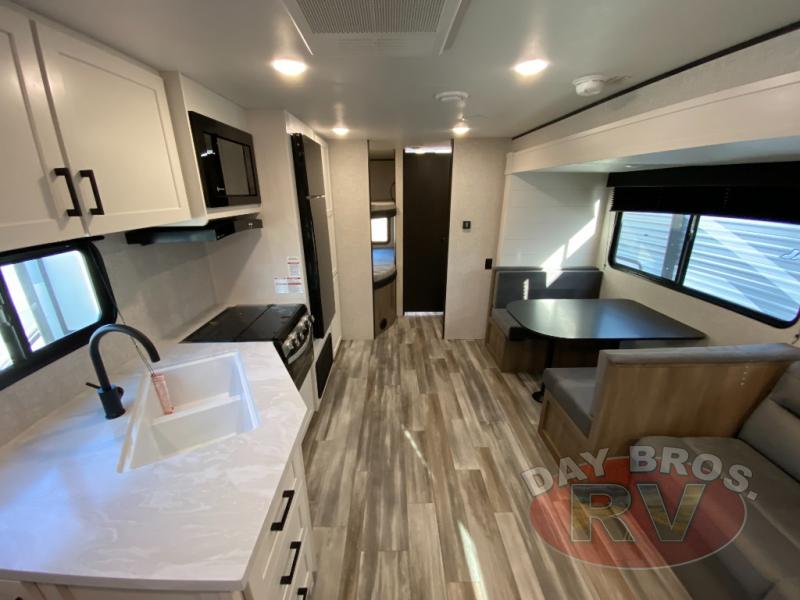 The Jay Flight SLX 261BHS features a single slide-out, enhancing the interior space to provide a comfortable living area. This model is thoughtfully designed to sleep up to eight individuals, making it perfect for family adventures or group excursions. The intelligently arranged sleeping quarters include a queen-sized bed, double bunk beds, and convertible dinette and sofa beds, ensuring a restful night's sleep for everyone. The interior is crafted with high-quality materials, offering a warm and inviting atmosphere.