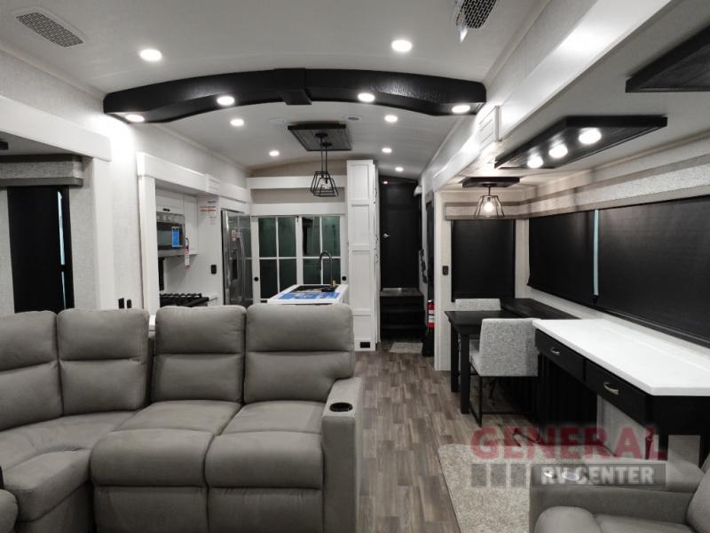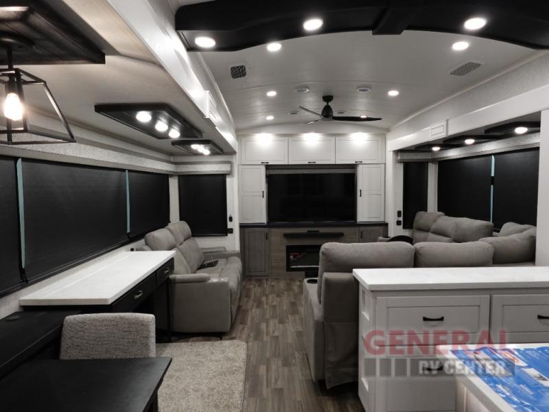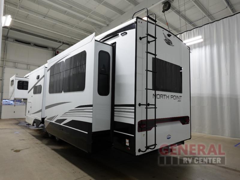 Measuring approximately 36 feet in length, the North Point 381CKRE provides a generous living space that can comfortably sleep up to four people. Whether you're traveling with family or friends, everyone will appreciate the thoughtful layout and high-quality finishes throughout. The interior boasts a modern design with plush seating, a fully equipped kitchen, and a cozy dining area, ensuring that every meal and moment is enjoyed in style. The luxurious master bedroom and additional sleeping options ensure a restful night's sleep after a day of adventure.