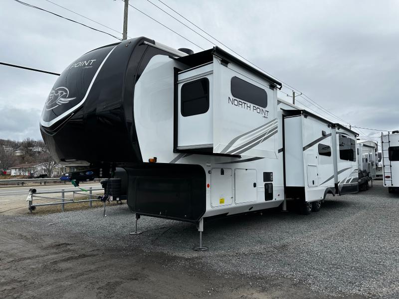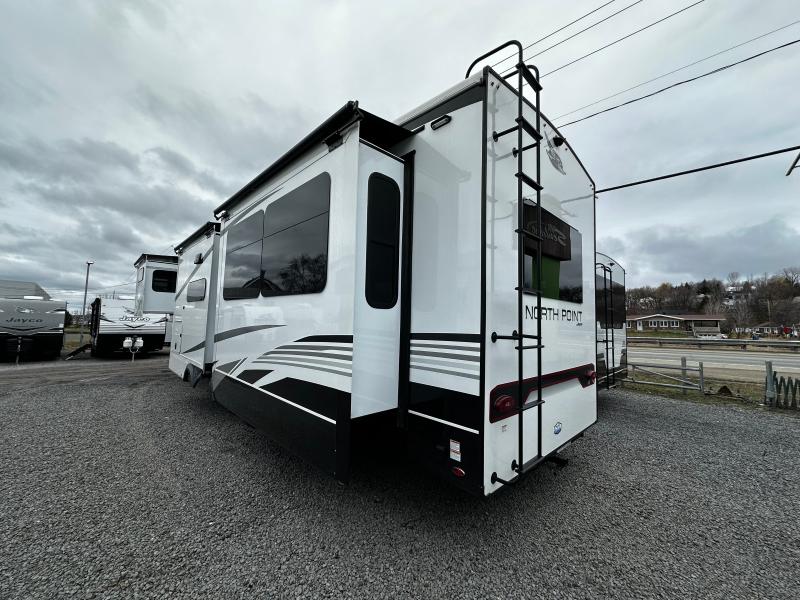 Step inside and be greeted by a spacious and elegantly designed interior that redefines the meaning of home on wheels. The North Point 381CKRE boasts a well-appointed living area with plush seating, a state-of-the-art entertainment system, and a cozy fireplace, creating the perfect ambiance for relaxation. The gourmet kitchen is equipped with top-of-the-line appliances, ample counter space, and a large pantry, making meal preparation a breeze. With a luxurious master suite featuring a king-size bed and a spa-like bathroom, you'll experience unparalleled comfort and tranquility.