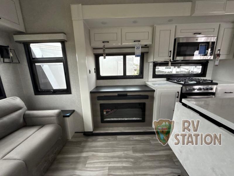 Step inside and be greeted by a lavish interior featuring high-end finishes and thoughtful design. The Pinnacle 36FBTS boasts a master suite with a king-sized bed and an en-suite bathroom, complete with a large shower and dual sinks. The living area is a haven of relaxation, featuring plush seating, a cozy fireplace, and a state-of-the-art entertainment system. The kitchen is a chef’s dream, equipped with a full-sized refrigerator, a convection microwave, and a three-burner stove, all set within elegant cabinetry and expansive countertops.