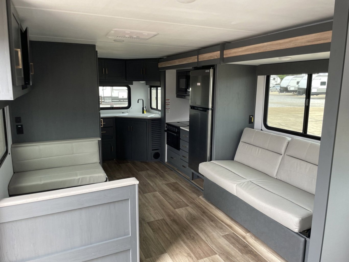 Step inside and be greeted by a thoughtfully designed interior featuring a rear kitchen layout. The kitchen is equipped with modern appliances, including a refrigerator, microwave, and a three-burner stove, all set to whip up your favorite meals. The cozy dinette is perfect for enjoying meals or playing games, and it easily converts into an extra sleeping area. The main sleeping quarters offer a comfortable queen-sized bed, ensuring a restful night’s sleep after a day of adventure. With ample storage throughout, you’ll have plenty of space to store all your travel essentials.