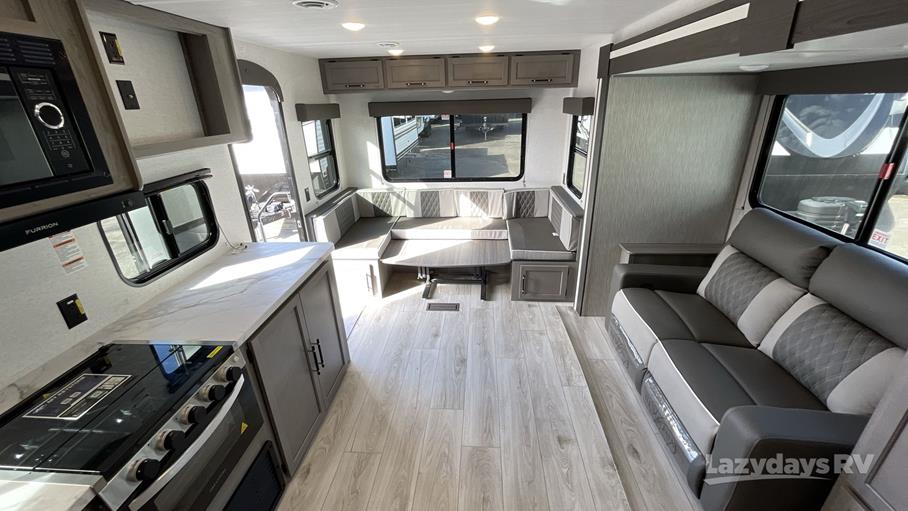 Measuring approximately 25 feet in length, the Hideout 25RDSWE is compact enough for easy towing yet spacious enough to sleep up to six people comfortably. Inside, you'll find a well-appointed interior featuring a cozy dining area, a fully equipped kitchen, and a comfortable sleeping arrangement that ensures restful nights after a day of adventure. The thoughtful layout maximizes space and functionality, providing a welcoming atmosphere for all your travel companions.