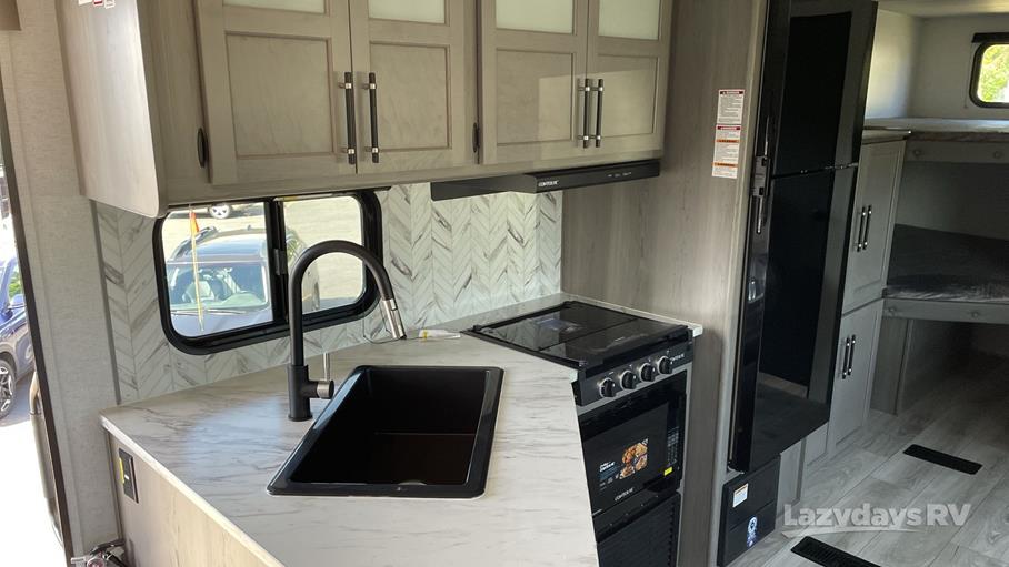 Step inside to discover a thoughtfully designed living space that boasts a contemporary aesthetic. The Hideout 269DBWE features a versatile floor plan with a cozy dinette and a plush sofa, both of which can be converted into additional sleeping areas. The master bedroom offers a comfortable queen-sized bed, ensuring restful nights after a day of exploration. The double-over-double bunk beds provide extra sleeping space, making this trailer perfect for families or groups. The kitchen is equipped with modern appliances, including a refrigerator, microwave, and a three-burner stove, all designed to make meal preparation a breeze.