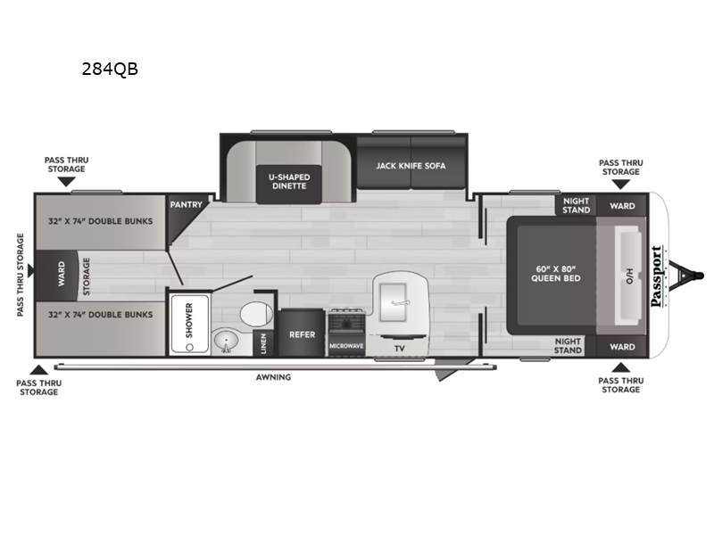 The Passport Classic 284QB features a single slide-out, which significantly enhances the living space, creating a welcoming environment for relaxation and entertainment. Designed to accommodate up to eight individuals, this travel trailer is perfect for family vacations or group outings. The intelligently designed floor plan includes a master bedroom, a cozy bunkhouse, and convertible sleeping areas, ensuring everyone has a comfortable place to rest after a day of exploration.