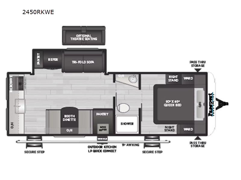 The Passport Super Lite 2450RKWE features a single slide-out, which significantly enhances the living area, providing ample room for relaxation and entertainment. Designed to comfortably accommodate up to five people, this travel trailer is ideal for families or small groups seeking adventure without sacrificing comfort. The intelligently designed layout includes a rear kitchen, offering modern appliances and ample counter space, making meal preparation a breeze. The cozy sleeping arrangements ensure a restful night's sleep, with a master bedroom and additional sleeping options for guests.