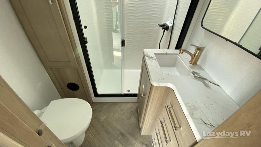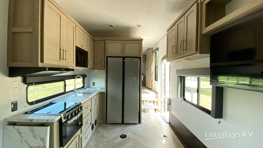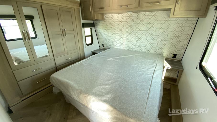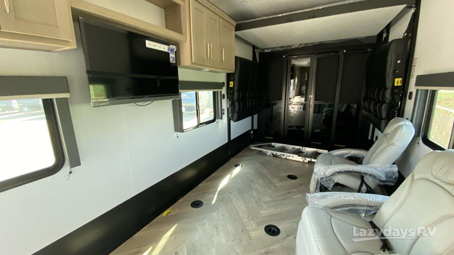The RV features one expansive slide-out, enhancing the living area to provide a roomy and inviting atmosphere. Inside, you'll find a modern kitchen equipped with top-of-the-line appliances, ensuring you can prepare meals with ease. The living area is designed for relaxation, featuring comfortable seating and entertainment options to keep everyone entertained during downtime. The sleeping quarters are equally impressive, offering cozy beds that promise restful nights after a day of exploration.