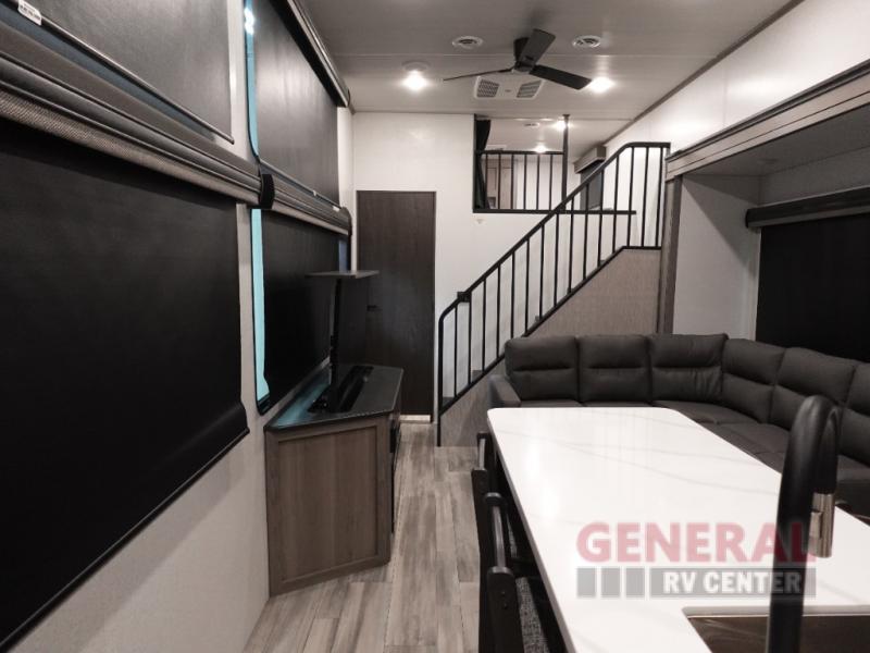 Step inside and be greeted by a thoughtfully designed interior that can comfortably sleep up to eight people. The two slide-outs create an expansive living area, providing plenty of room for everyone to spread out and enjoy. Whether you're hosting a family dinner or a game night with friends, the open-plan living and dining area is perfect for entertaining. The modern kitchen is equipped with all the essentials, making meal prep a breeze, while the cozy sleeping quarters ensure a restful night's sleep after a day of exploration.