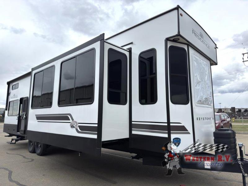 Introducing the 2025 Keystone RV Residence 401FSRL Park Model, a perfect blend of luxury and functionality designed for those who crave adventure without sacrificing comfort. This spacious RV features three slide-outs, providing ample room for relaxation and entertainment. With a length of 40 feet, it offers a generous living space that can comfortably accommodate up to eight people, making it ideal for family trips or gatherings with friends.